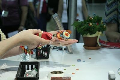 One of my favorite ddemonstrator presentations on Wednesday night was all about Buttons. We have a new stamp set (Button Buddies p. 71 #122737-clear) dedicated to using our buttons. Each of the 8 stamps in the set goes with a button. Linda Heller had so many incredible ideas to use, store, and give away buttons. Of they are just so shiny and touchable on her button cookie tray. How inviting! Check out her button bracelet in the top picture. Not sure how she made it, but I love it! She also has a button ring.